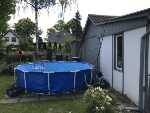 Der Pool stand letztes Jahr ganz schön schief, also hatte ich die Fläche geebnet und mit Platten einigermaßen alles in Waage ausgelegt. Nun steht der Pool drauf, der normale Filter ist Dank Schwiegerpapa einer Sandfilteranlage gewichen und zum schnelleren Aufheizen des Pools hab ich nen schwarzen Schlauch auf die Laube gelegt in dem dann auch Wasser aus dem Pool zirkuliert.