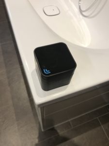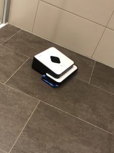 Der kleine schwarze Würfel wird als “Indoor-GPS” Sender aufgestellt und mit der Start-Taste fängt der kleine iRobot Braava 390t an, die Fläche zu wischen.