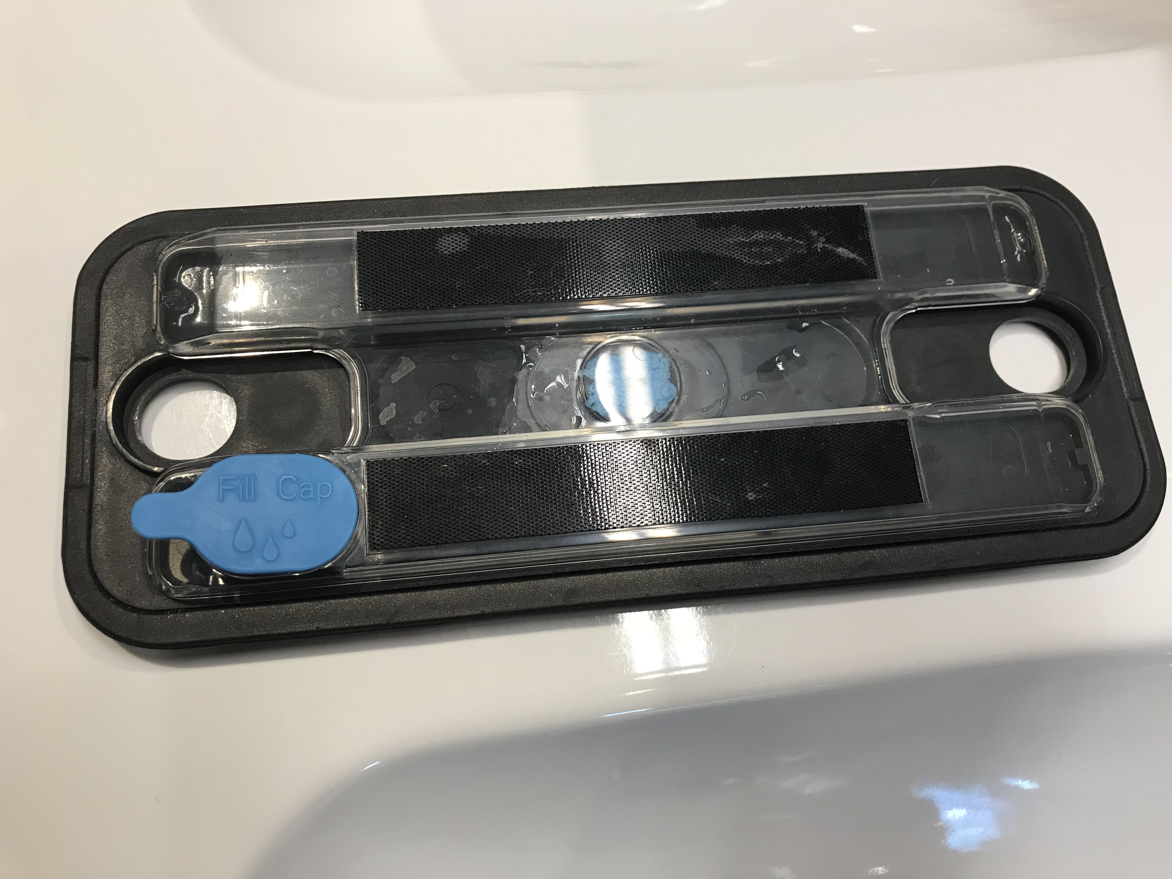 In dem kleineren vorderen Teil mit dem blauen Lappen wird Flüssigkeit gefüllt, bei uns Fliesenreiniger.
